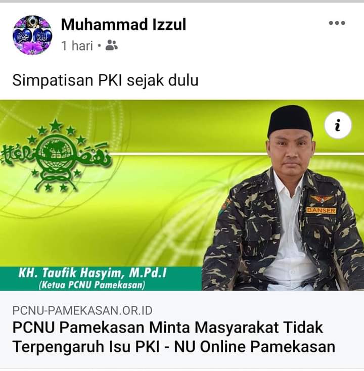 Sebagai informasi, akun facebook bernama Muhammad Izzul, Kamis (01/10/2020), mengunggah link berita NU Online Pamekasan yang berisi ajakan Ketua PCNU Pamekasan, KH. Taufik Hasyim, agar masyarakat tidak terpengaruh isu kebangkitan PKI. Dalam unggahannya, MI membubuhkan caption provokotif yang membuat warga NU Pamekasan geram.