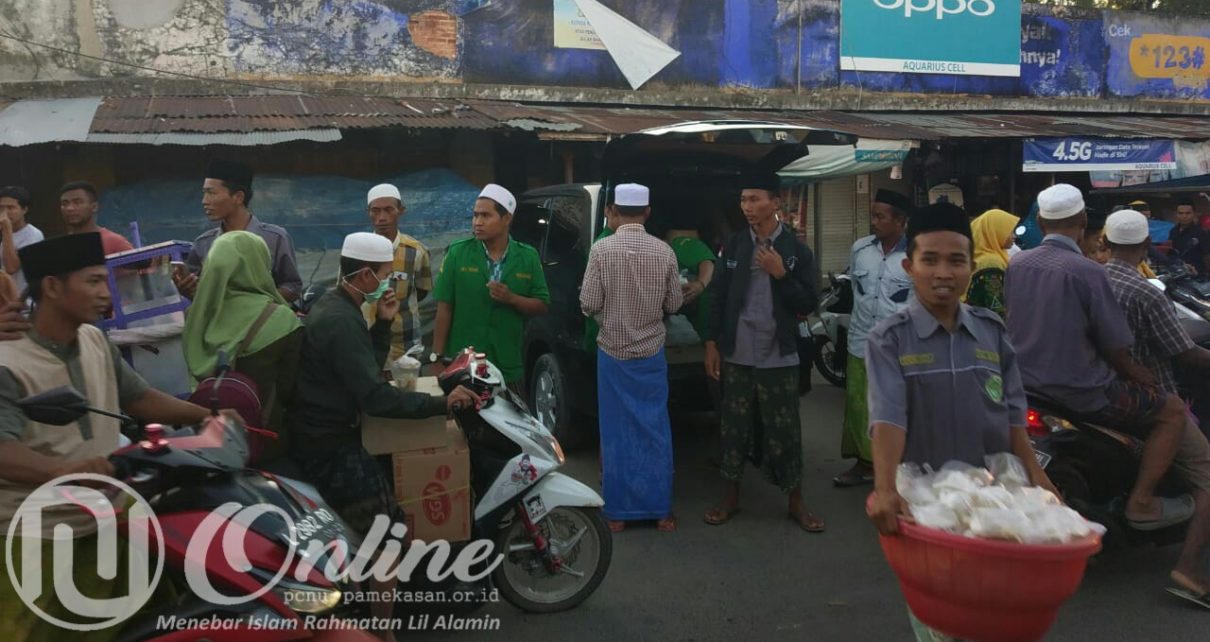 SAMPANG — Pengurus Pimpinan Anak Cabang (PAC) Gerakan Pemuda (GP) Ansor bersama Ikatan Pelajar Nahdlatul Ulama (IPNU) dan Ikatan Pelajar Putri Nahdlatul Ulama (IPPNU) Kecamatan Karangpenang menggelar khatm al-Qur’an dan bagi-bagi takjil bagi warga yang melintas di sepanjang jalan Pasar Karangpenang, Sabtu sore (25/05/2019).